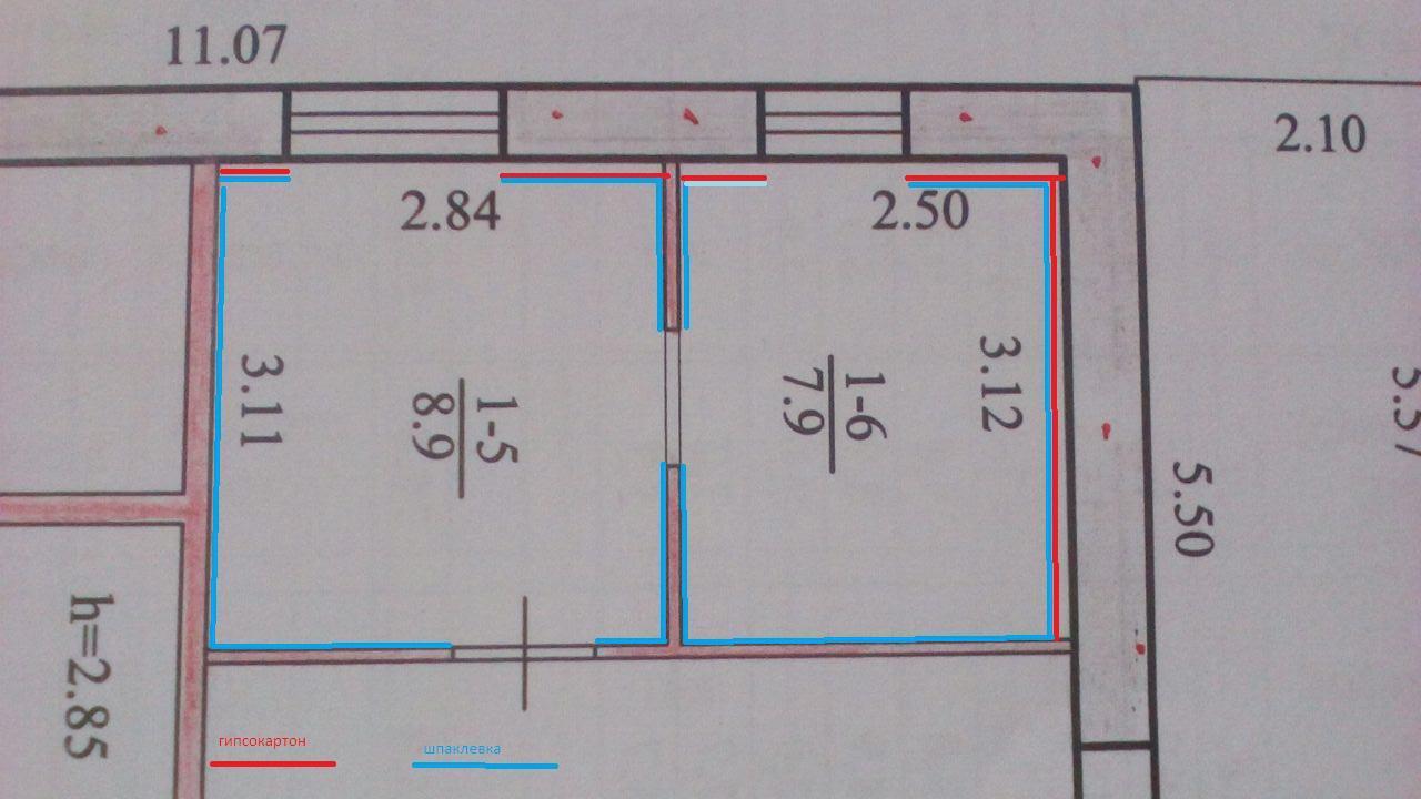 Шпаклевка всех стен комнат под покраску. Откосы (2 окна), гипсокартнонный потолок.