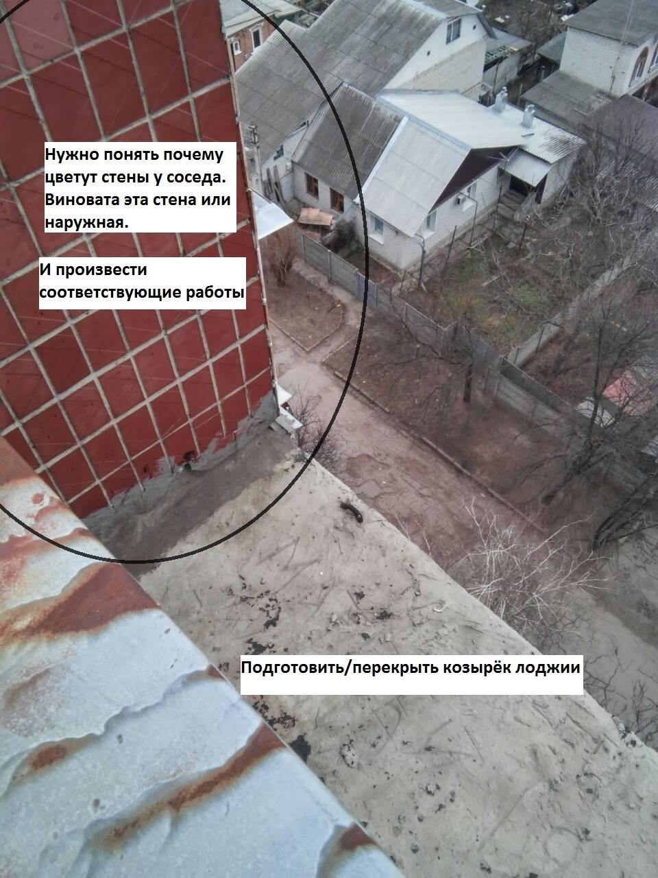 Необходимо подготовить/перекрыть козырёк лоджии рубероидом в 2 слоя, а так же провести ремонт 2-х стыковых вертикальных стен (где-то попадает влага и у соседа цветут стены). Что на стенах необходимо делать не знаю, необходим Ваш профессиональный вердикт. 9 этаж. На чердаке сказали сухо.