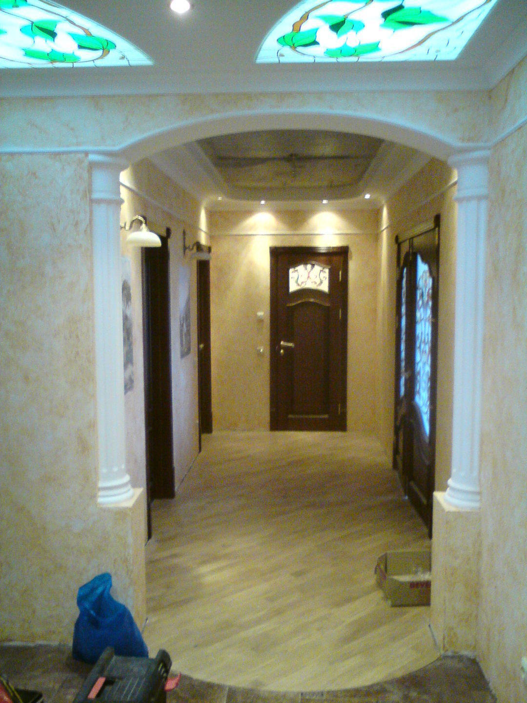 Ремонт квартиры в новострое.Частичный демонтаж кирпичных перегородок,устройство новых.Штукатурные работы,малярные работы,плиточные работы,устройство сложных радиусных потолков из гипсокартона,электромонтажные и сантехнические работы,установка витражей.