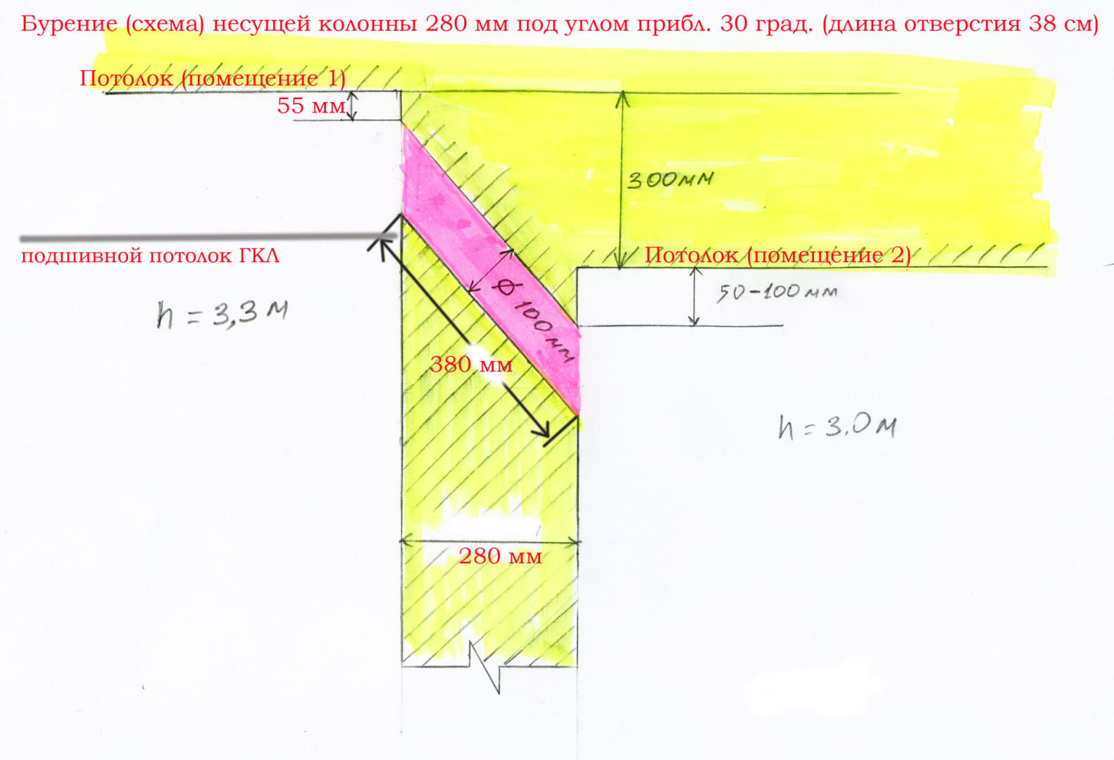 1. Отверстие диаметром 110 мм наклонное (под углом прибл. 30 градусов) под потолком для вентиляции в ЖБ колонне 280 мм (от потолка высокого Н=3300 мм помещения-1 отступить 50...60 мм - вход / выход отверстия: 50 - 100 мм от потолка помещения-2 Н=3000 мм), длина готового отверстия - прибл. 380 мм. См. схему на рисунке.