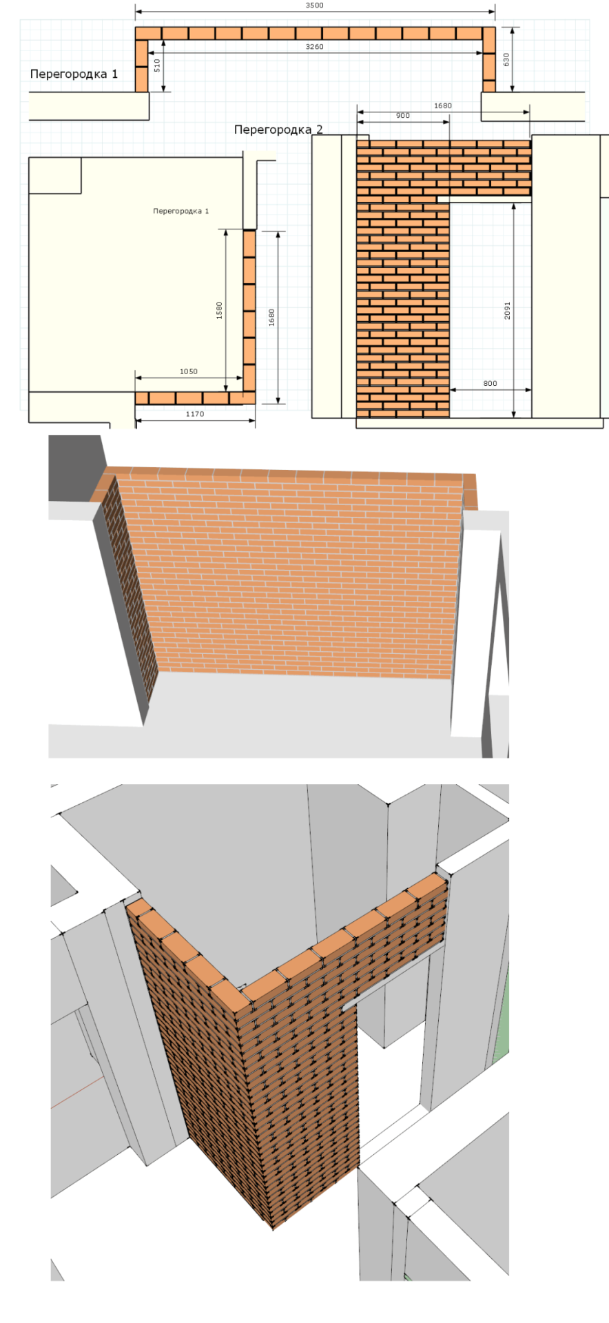 Выложить 2 перегородки 1/2 полнотелый кирпич, как показано на рисунке.