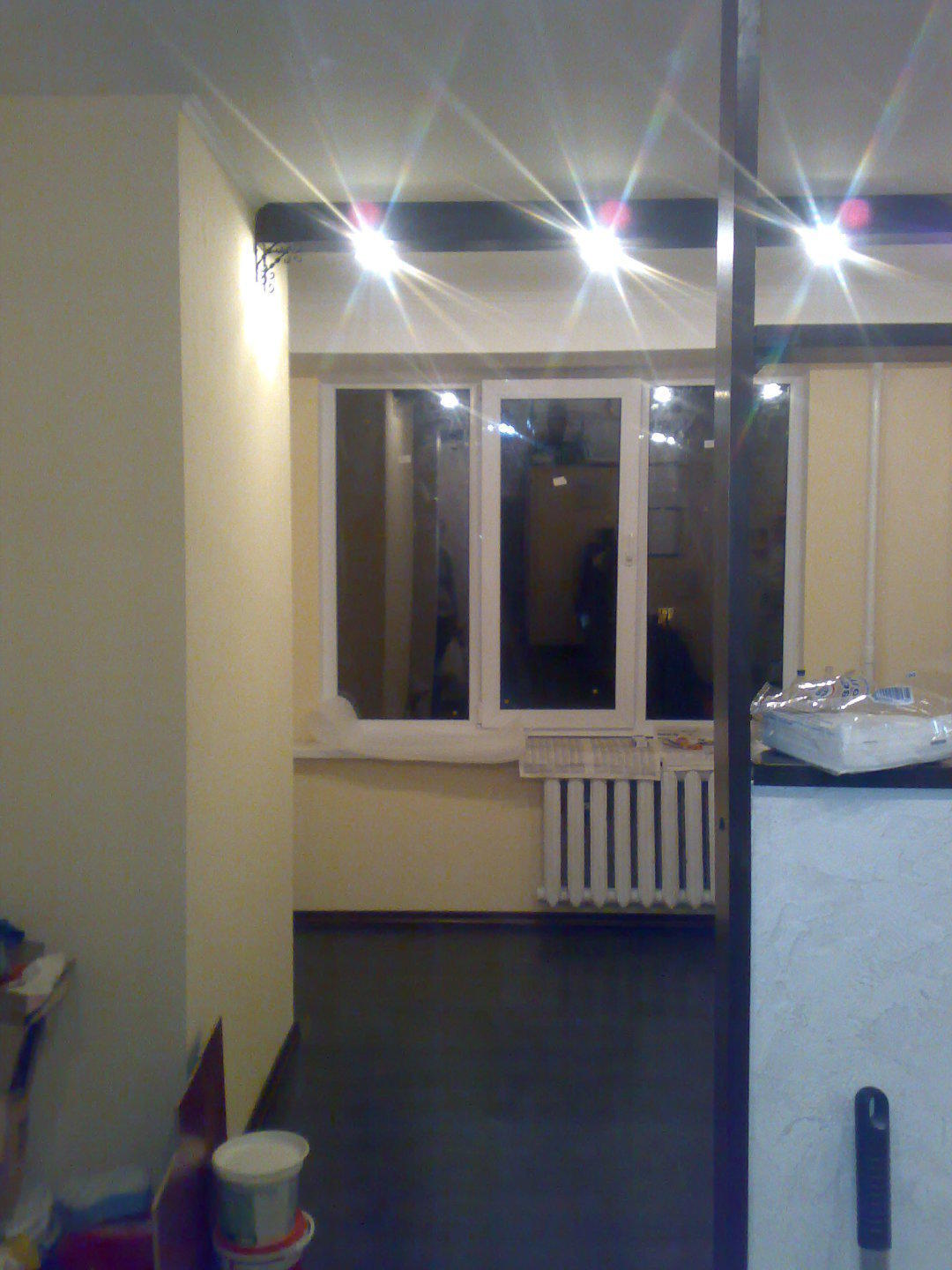 демонтаж обоев ,побелка потолка,демонтаж старых плинтусов,демонтаж подоконника,демонтаж старого встроенного шкафа. монтаж( электропроводки, утеплении торцевой стены,грунтовка стен и потолка, стартовая штукатурка на стены и на потолок. финишная шпаклёвка .комната разделена на две зоны,мини кухня и спальня.сделана на стенах декоративная штукатурка,на потолке сделаны декоративные балки с встроенным светом.на пол уложен ламинат поклеины плинтуса.покрашены батареи .сделаны откосы .