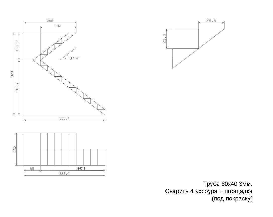 Необходимо выполнить сварочные работы по изготовлению металлического каркаса лестницы. Из чертежа который в приложении нужно сварить 4 хребта (косоура) и площадку. Труба 60х40 3мм.