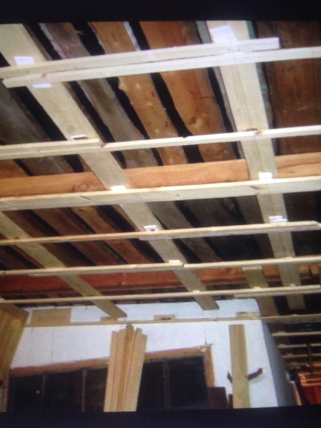 Нужно сделать потолок (16 м2) деревом как на фотографии. Сразу прибивается доска, потом брусы и к брусам уже рейки.