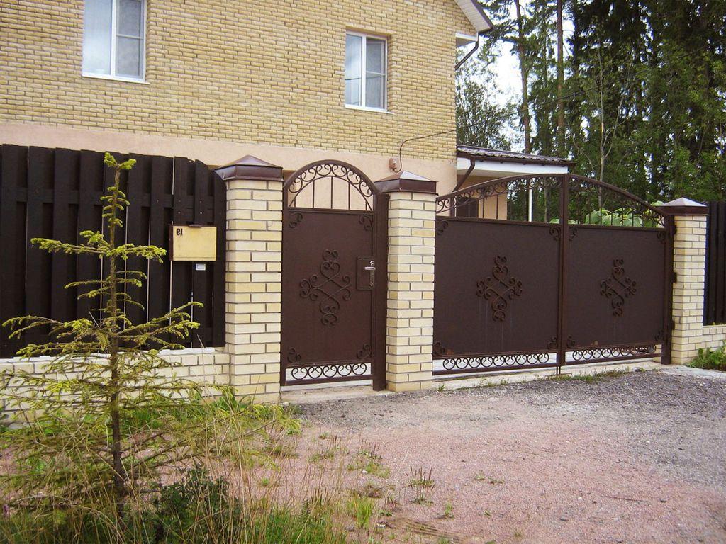 Изготовление и установка ворот и калитки из одностороннего ровного профнастила с рамкой по периметру при высоте 2м, ширине 4м, ворота, высоте 2м, ширине 1м калитка. Элементы художественной ковки, замок, петли и притвор на калитку, засовы на ворота ворота и калитка дугой. Три столба 80*80 с бетонировкой.