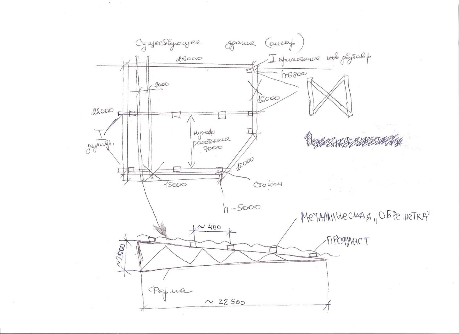 Необходимо изготовить и установить металлический каркас с фермами размерами 26 м на 22 м (ангар-навес) с покрытием его оцинкованым профилем.Эскиз в файле.жду предложений.