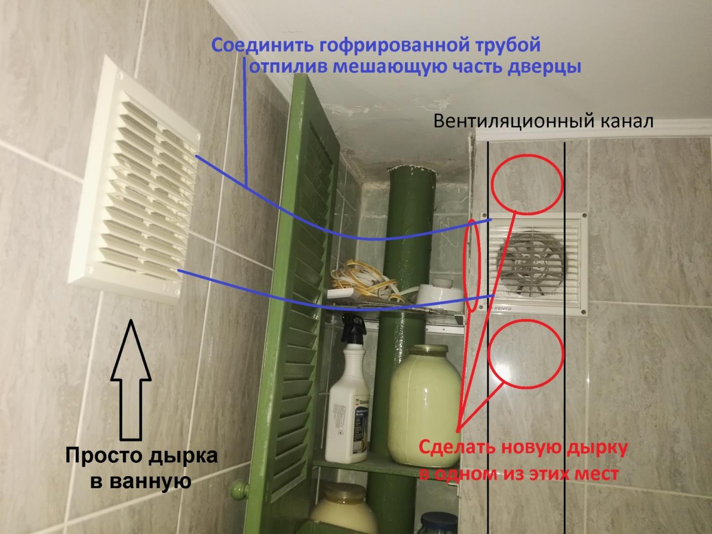 Рассмотрю и другие варианты решения, чтоб сделать вытяжку из ванны в вентиляционный канал по указанному фото.