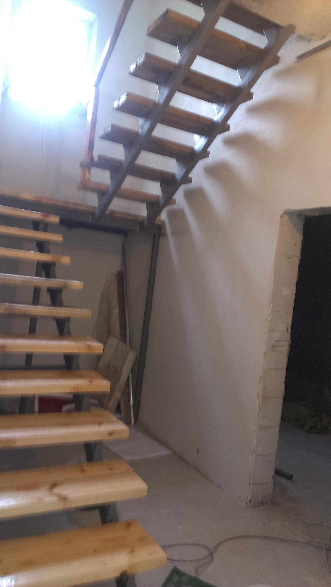 Чистовая зашивка лестницы, 11 ступеней с подступеньками, 7 ступеней открытые. Поворотная площадка на 180 град. Зашивка дуб+шлифовка+покраска. Материал закуплен (дуб, пр-во Клен). Установка ограждений (метиллаческие столбы+релинги), закуплено.