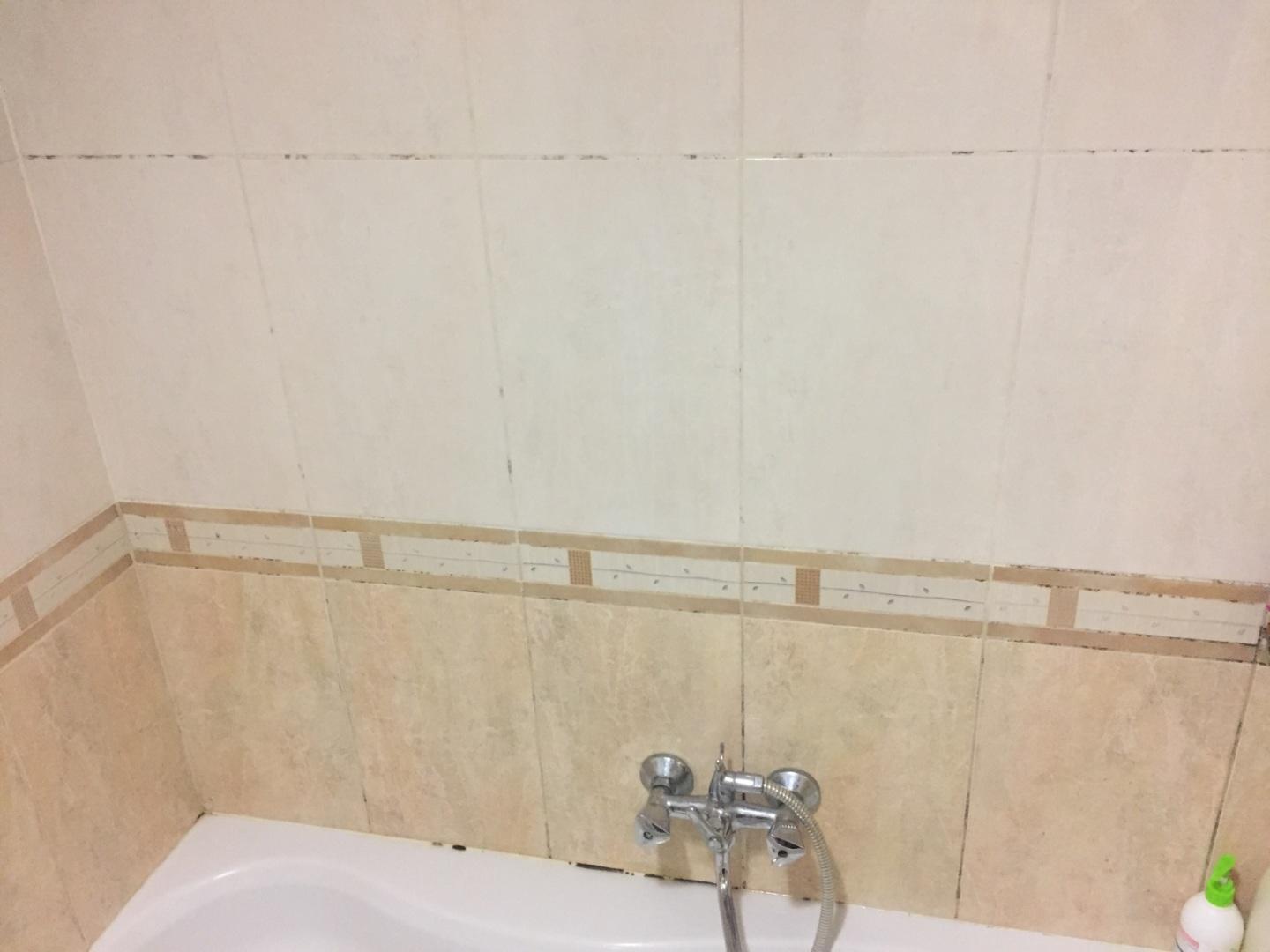 Нужно убрать старые швы между плиткой в ванной, которые повреждены грибком и затем затереть новые.