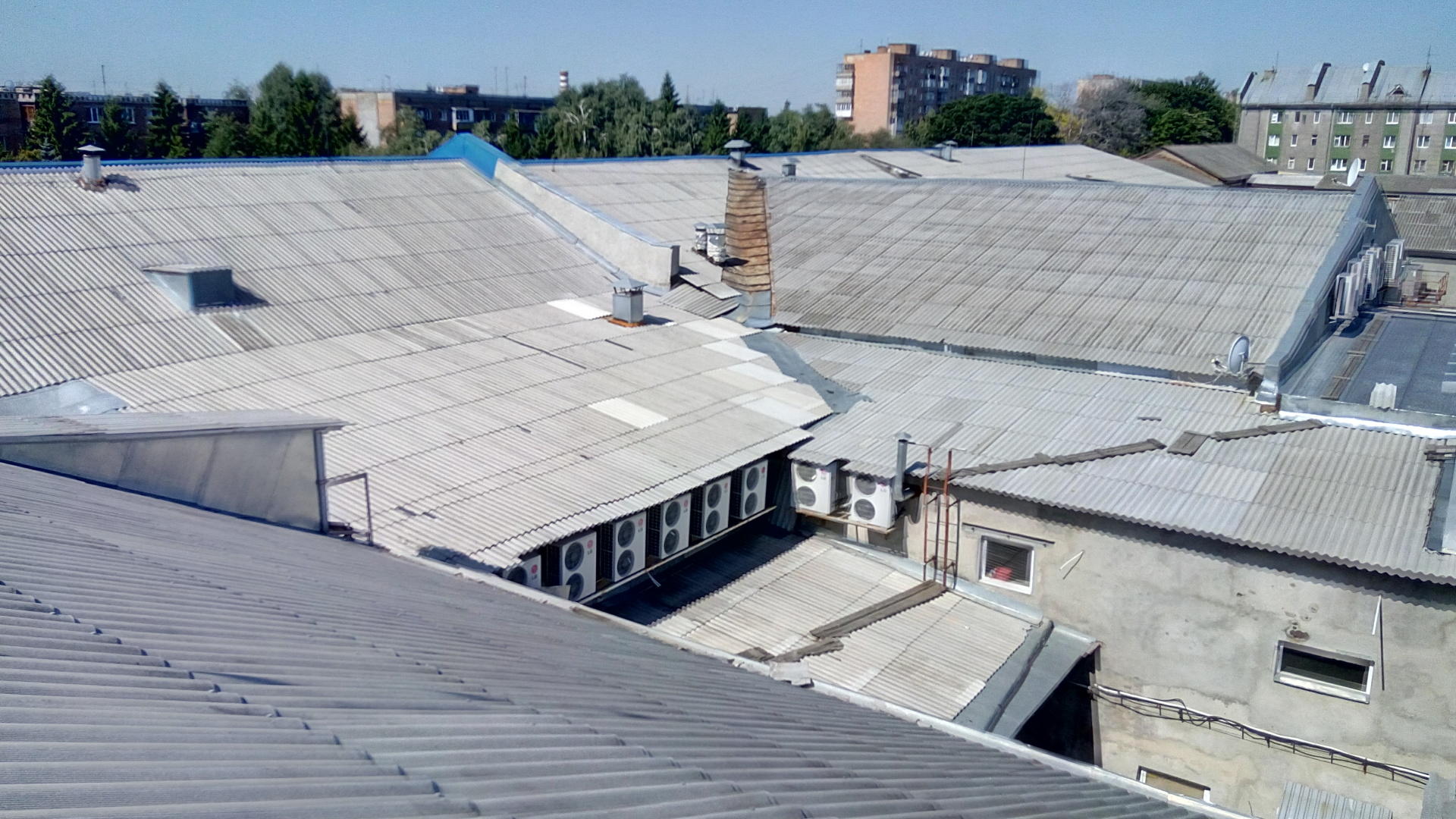1.Демонтаж старого шифера, металла, коньков, планок примыкания, непригодных деревянных изделий (брус, обрешетка и т.д.). на площади 4100 м.кв