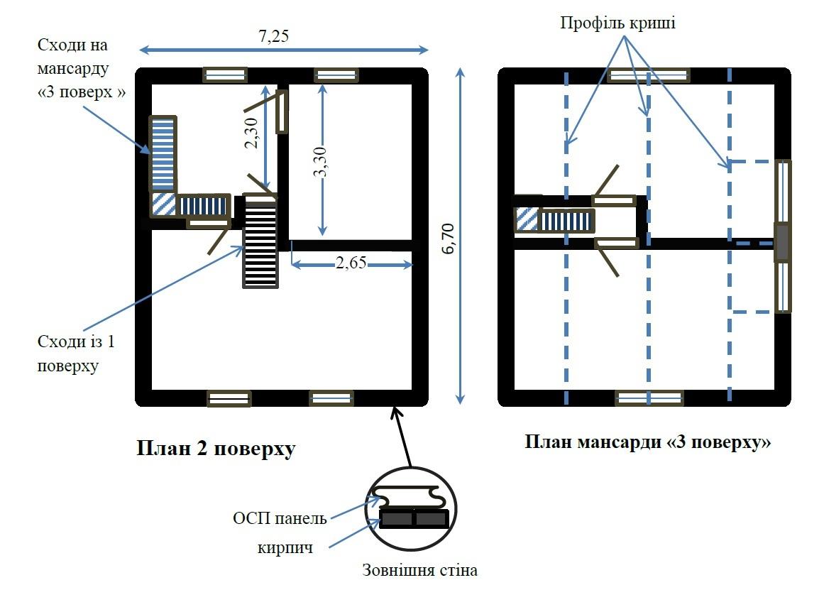 Высота 2 этажа 2,5 м., мансарда 1 м. по периметру.