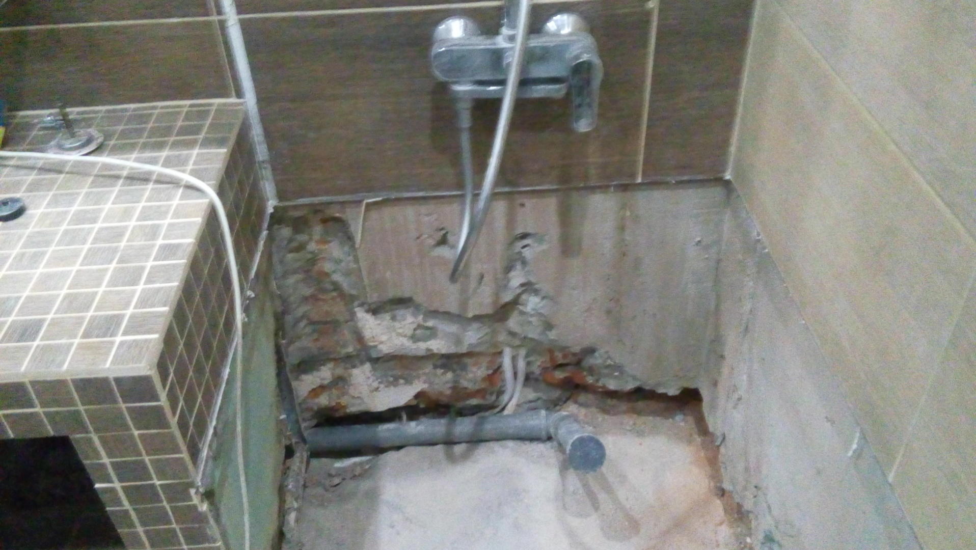 В двух словах - в стене потекла труба, в связи с чем пришлось разбивать плитку, чтобы устранить тещь. Приблизительный перечень работ: 1) повторно убедиться, что вода не течёт (с помощью манометра), 2) убрать тубму (на фото слева), 3) на месте тумбы убрать остатки плитки на полу и стене, 4) положить плитку под ванной и за ванной 5) поставить ванну на место