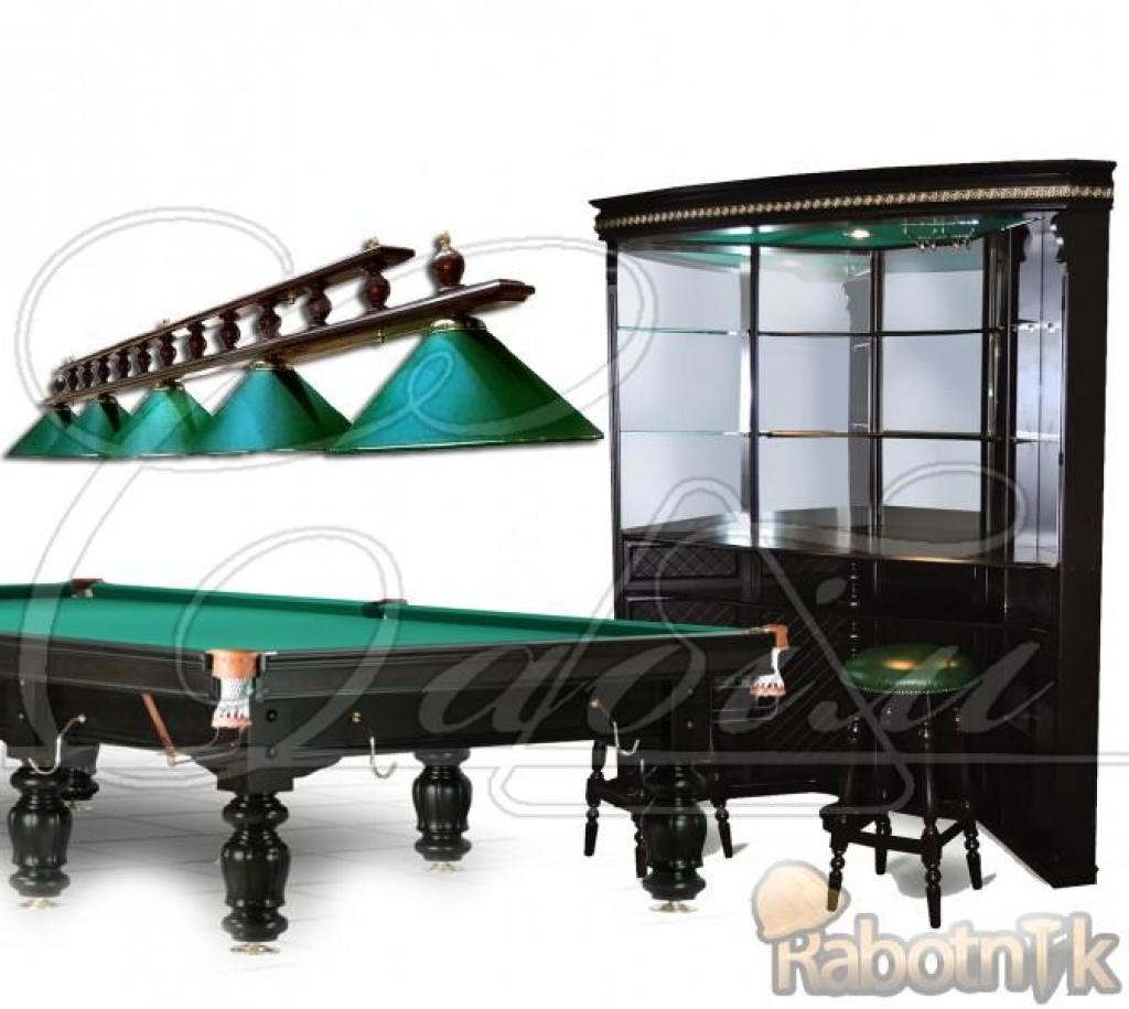 Наряду с продажей бильярдных столов, наша компания занимается обустройством бильярдных клубов и бильярдных комнат в частных домах. Мы предлагаем готовые интерьерные решения для бильярдной комнаты, подбор бильярдного стола, аксессуаров (лампы, светильники для бильярда, мебель и т.д.) и специального оборудования. <br />Бильярдный интерьер "Принц": <br />1. Бильярдный стол "Принц" <br />2. Барная стойка "Виктория" <br />3. Табурет барный "Классик" или "Элит" <br />4. Бильярдный светильник "Премьер" <br /> <br />При покупке этого бильярдного интерьера, скидка 5%
