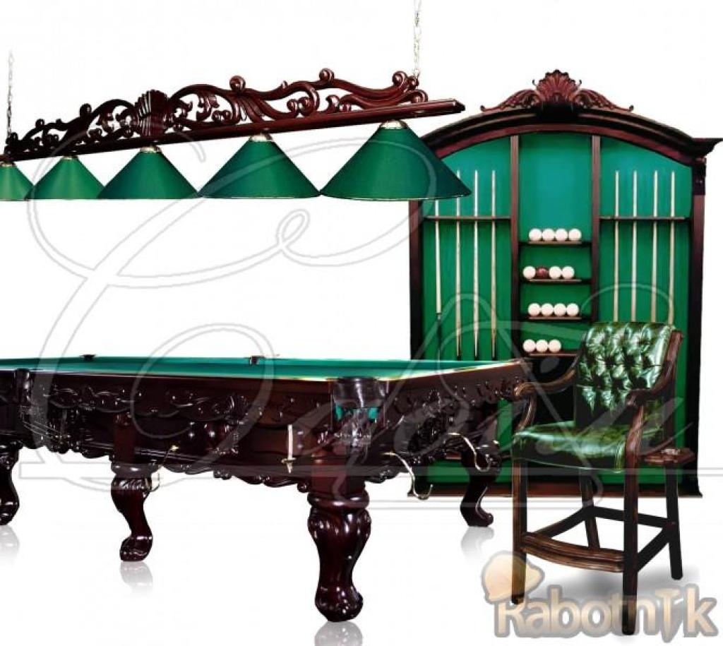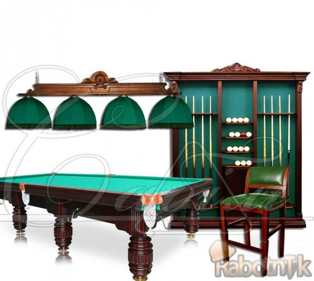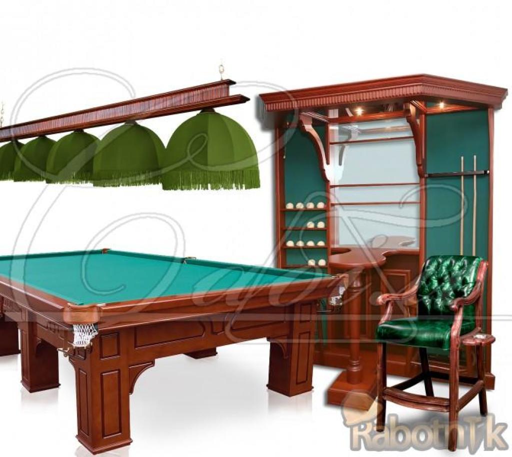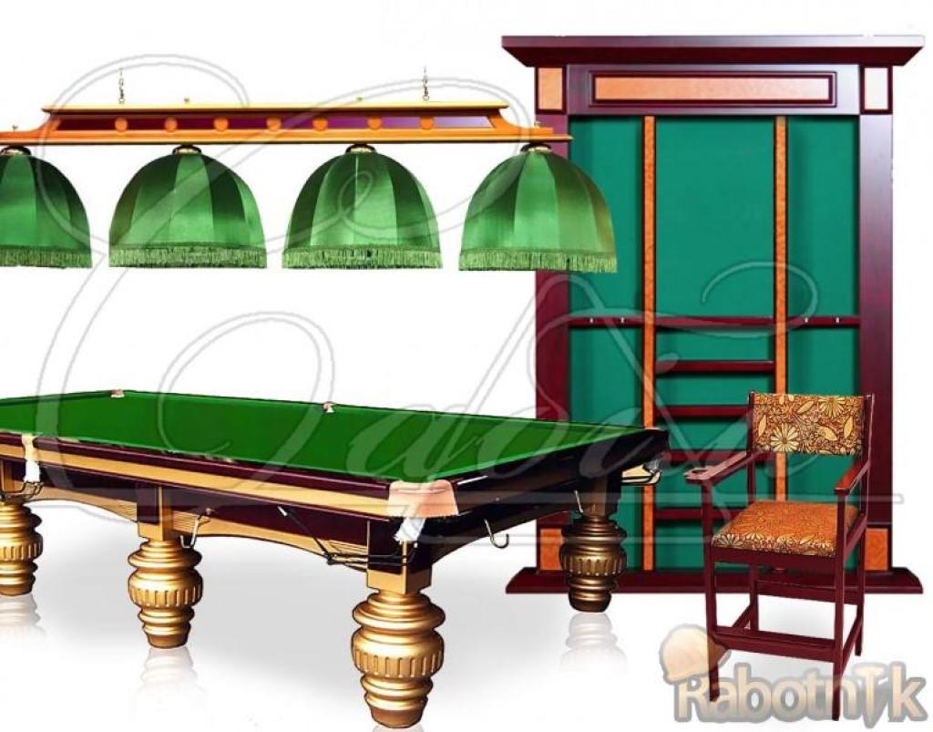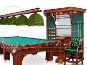 Наряду с продажей бильярдных столов, наша компания занимается обустройством бильярдных клубов и бильярдных комнат в частных домах. Мы предлагаем готовые интерьерные решения для бильярдной комнаты, подбор бильярдного стола, аксессуаров (лампы, светильники для бильярда, мебель и т.д.) и специального оборудования. <br />Бильярдный интерьер "Royal": <br />1. Бильярдный стол "Royal" <br />2. Киевница "Респект" <br />3. Бильярдное кресло "Кардинал" <br />4. Бильярдный светильник "Royal" <br /> <br />При покупке этого бильярдного интерьера, скидка 7%