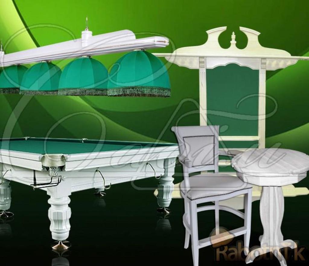 Наряду с продажей бильярдных столов, наша компания занимается обустройством бильярдных клубов и бильярдных комнат в частных домах. Мы предлагаем готовые интерьерные решения для бильярдной комнаты, подбор бильярдного стола, аксессуаров (лампы, светильники для бильярда, мебель и т.д.) и специального оборудования. <br />Бильярдный интерьер "Моцарт": <br />1. Бильярдный стол "Моцарт" <br />2. Киевница "Девил" белая <br />3. Барный стул "Roma" белый <br />4. Клубный стол белый <br />5. Светильник "Атлант" <br /> <br />При покупке этого бильярдного интерьера, скидка 5%