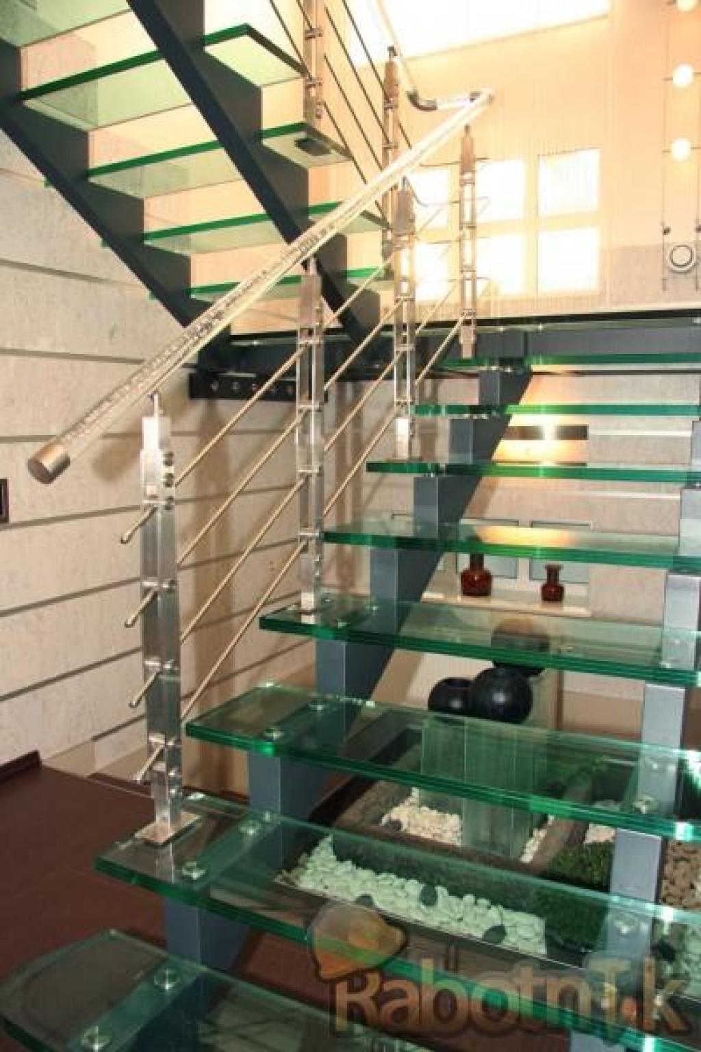 Стеклянная лестница, ступени из стекла, ограждение н/ж, акриловый поручень